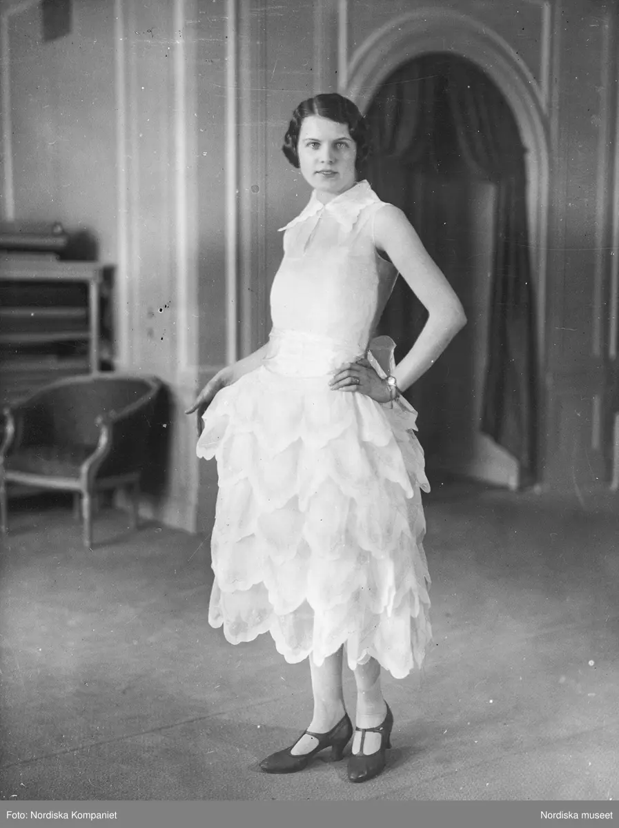 Mannekäng i vit klänning med bladformade etapper och spetsig krage, skor med t-slejf. NK:s Franska damskrädderi.