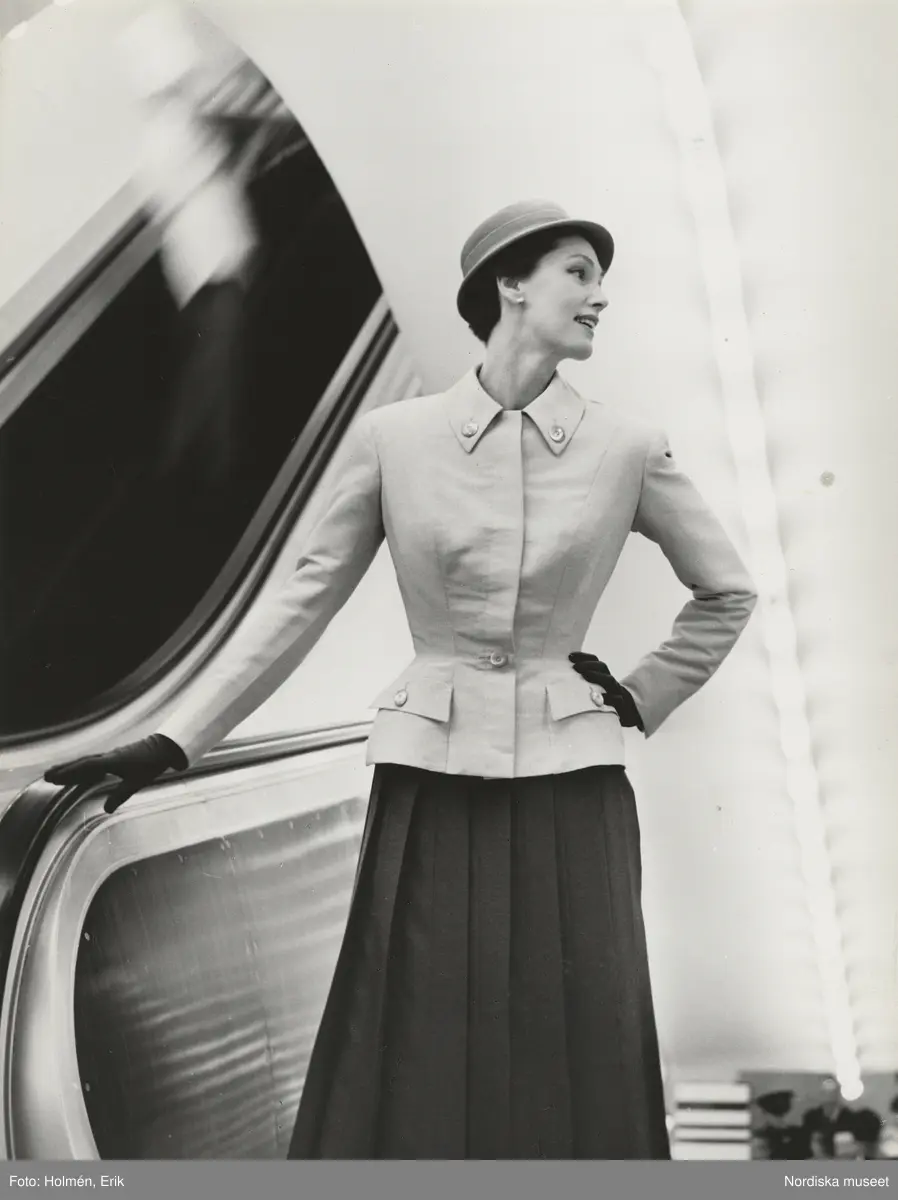 Modell i ljus jacka, veckad kjol, hatt och handskar vid rulltrappa. Original Patou.