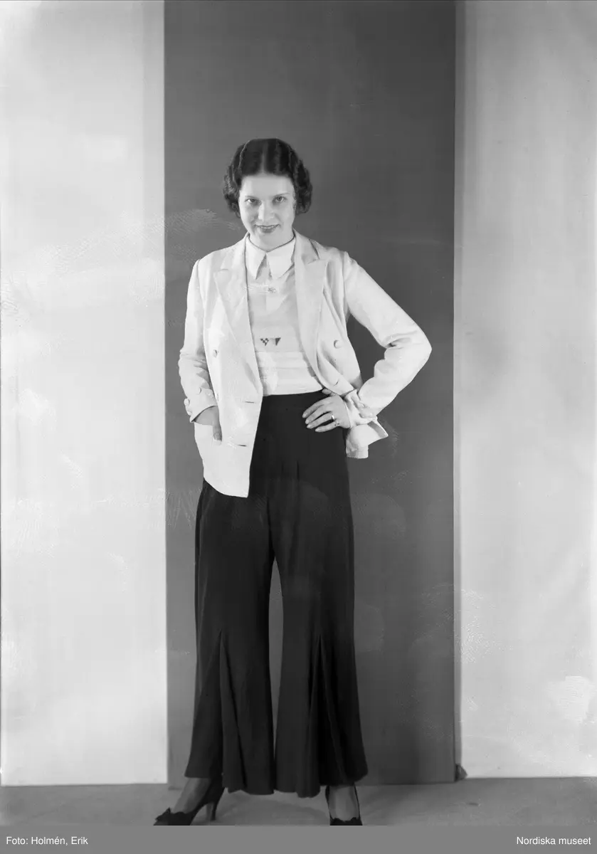 Kvinnlig modell iklädd kostym med byxor och kavaj. Vårmode 1931, Nordiska Kompaniet.