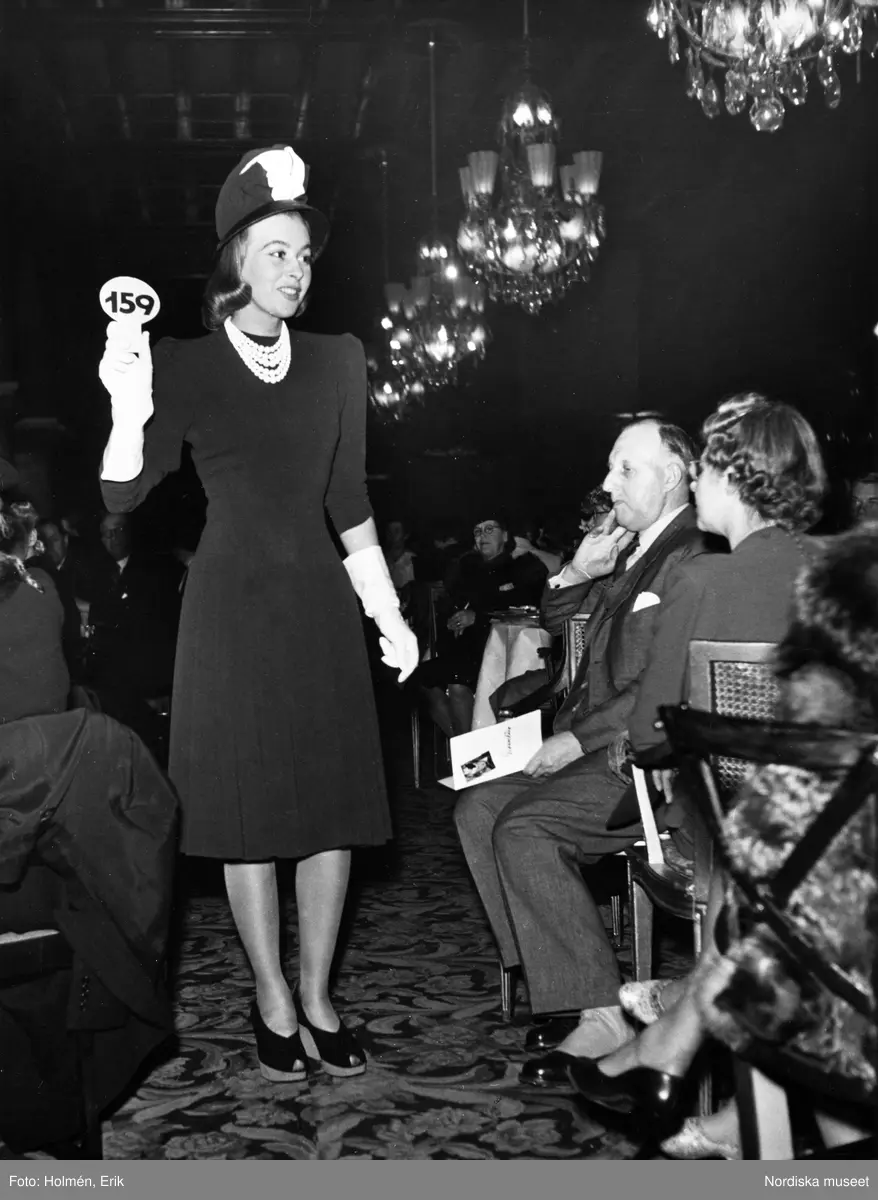 Modell, fröken Hammarström, klädd i mörk klänning med liten puffärm, vitt pärlhalsband, vita handskar, svarta skor med öppen tå och kilklack, samt hatt. I handen håller fröken Hammarström en skylt där det står 159. På bilden syns även delar av publiken och ljuskronor i taket. Röda Kors-fest på biografen Royal, Stockholm.