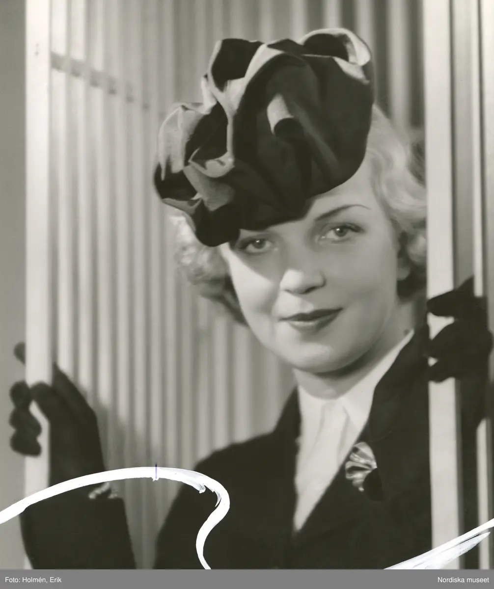 Porträtt av kvinna klädd i hatt med veck, kavaj, blus, handskar och brosch.