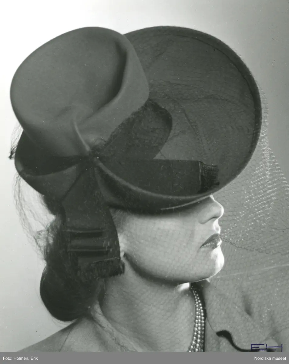 Porträtt av mannekängen och skådespelerskan Hjördis Genberg i hatt med flor och hattband med fransar, från Rose Descat för NK.