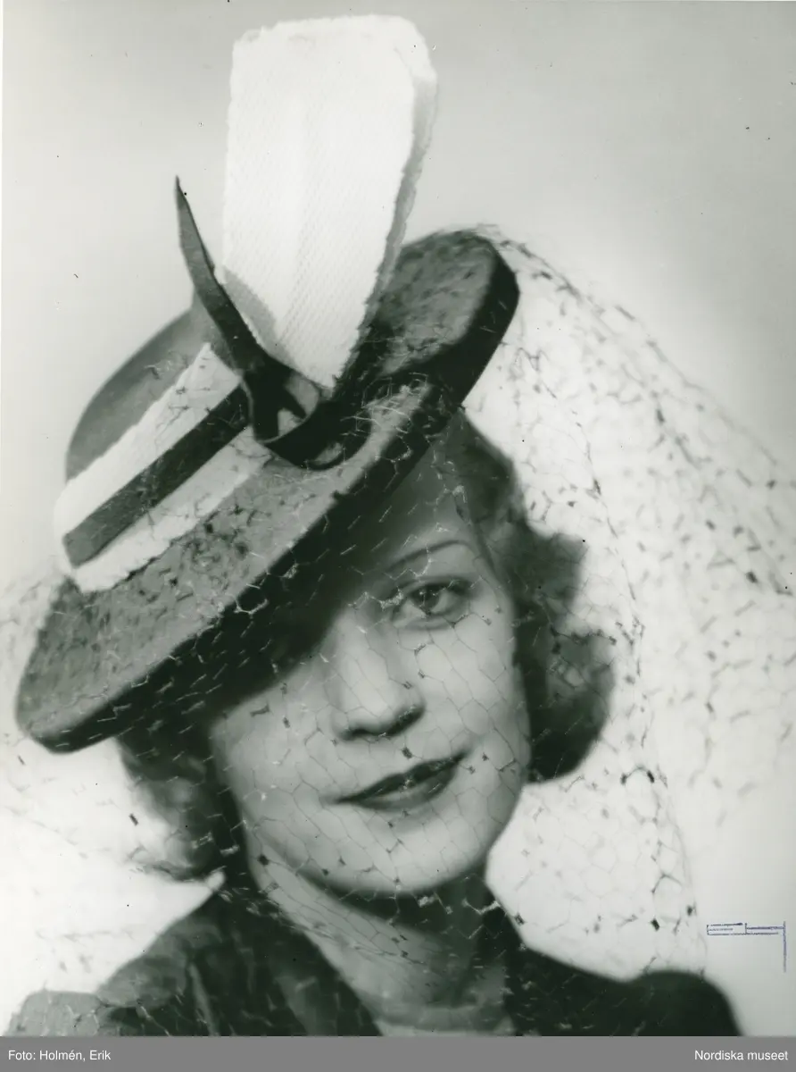 Fb, Porträtt av kvinna med hatt från Caroline Reboux. Marinblå med ripsband och flor.