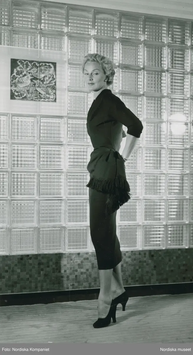 Modell i klänning och pumps, vid en tavla på betongglas.