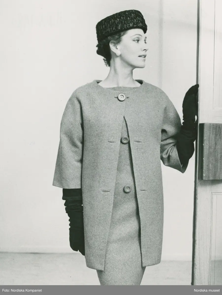 Mannekäng i kappa och klänning, pillerburkshatt och handskar. Original från Givenchy, NK:s Franska damskrädderi.
