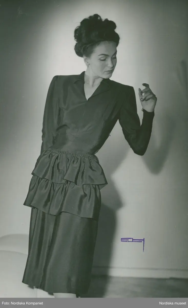 Modell i svart sidenklänning av Edward Molyneux. Håruppsättning.