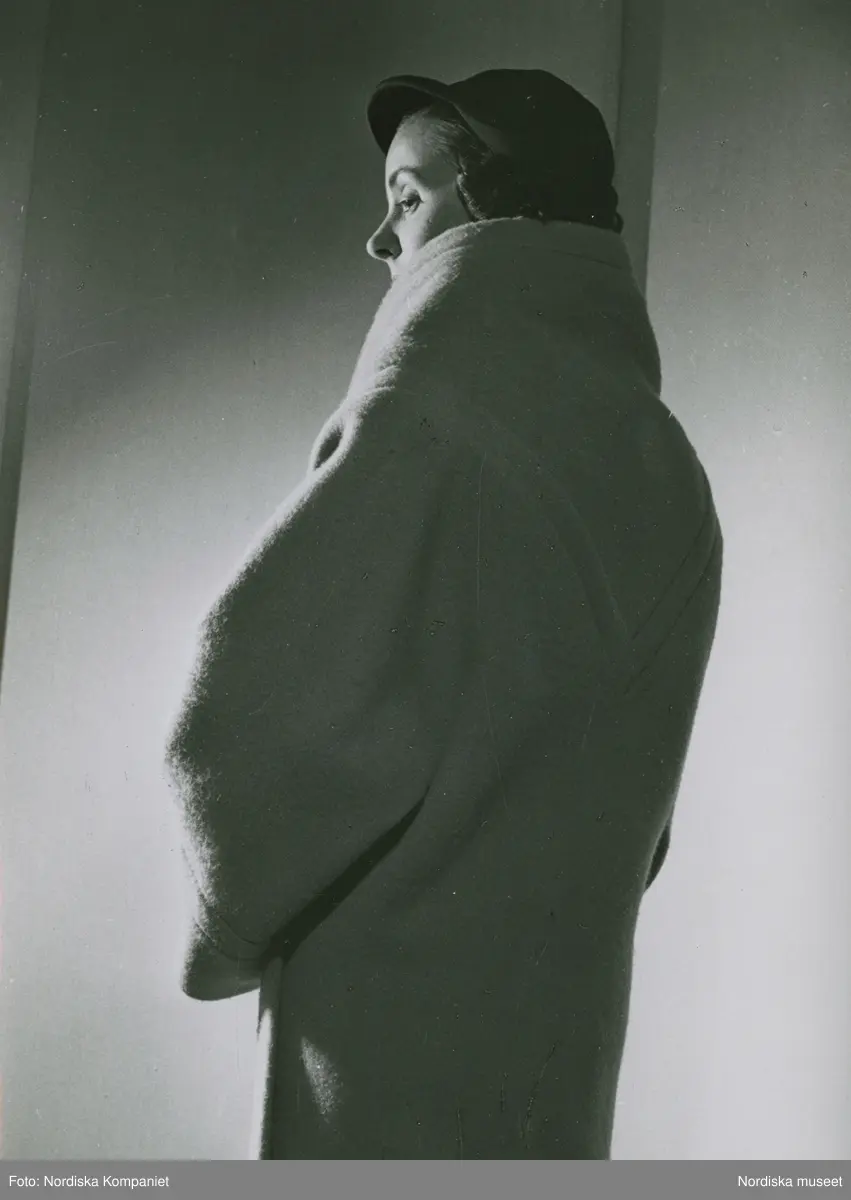 Modell fotad bakifrån i yllekappa och hatt.