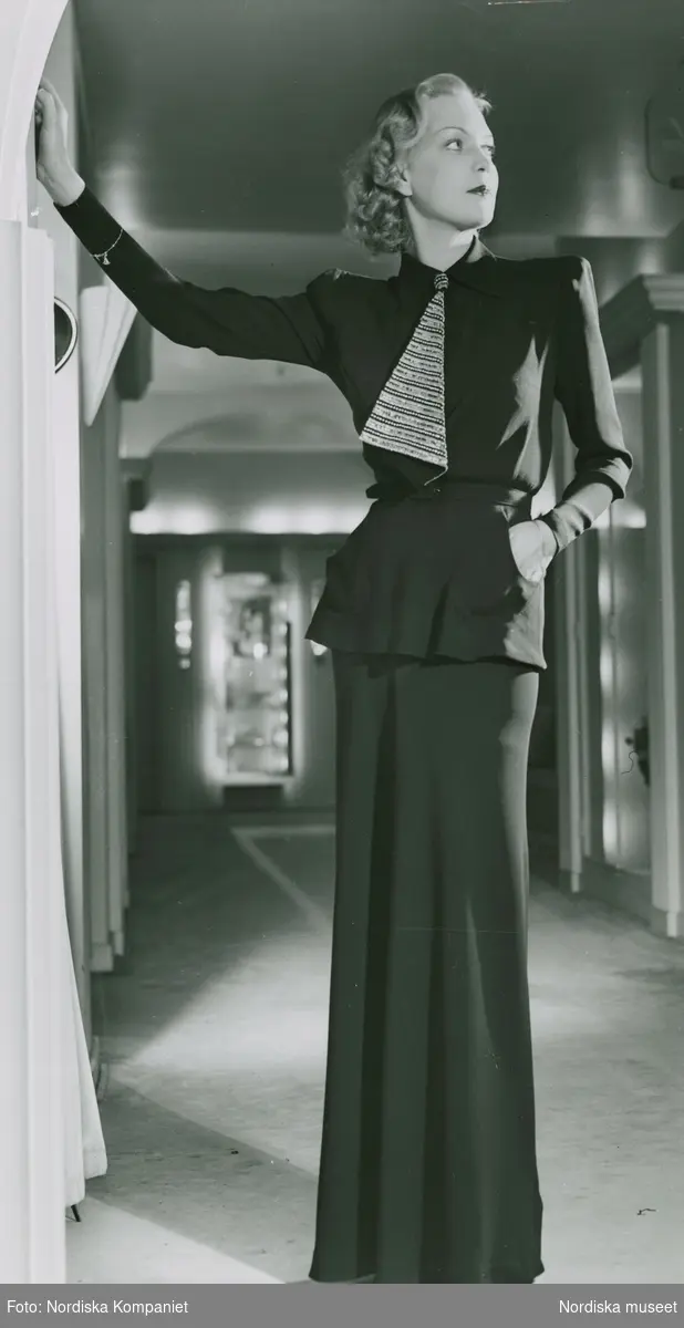 Mannekäng i hellång klänning och slips på NK:s Franska damskrädderi.