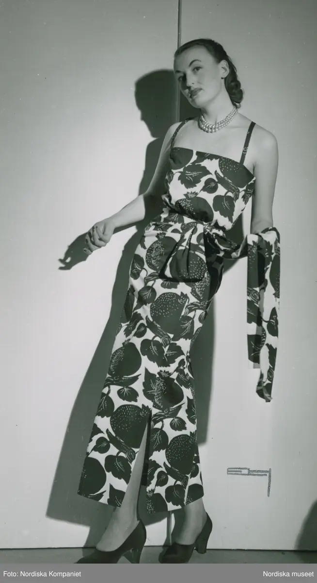 Modell i stormönstrad klänning med slits och midjeband, pärlhalsband och pumps, från Edward Molyneux.