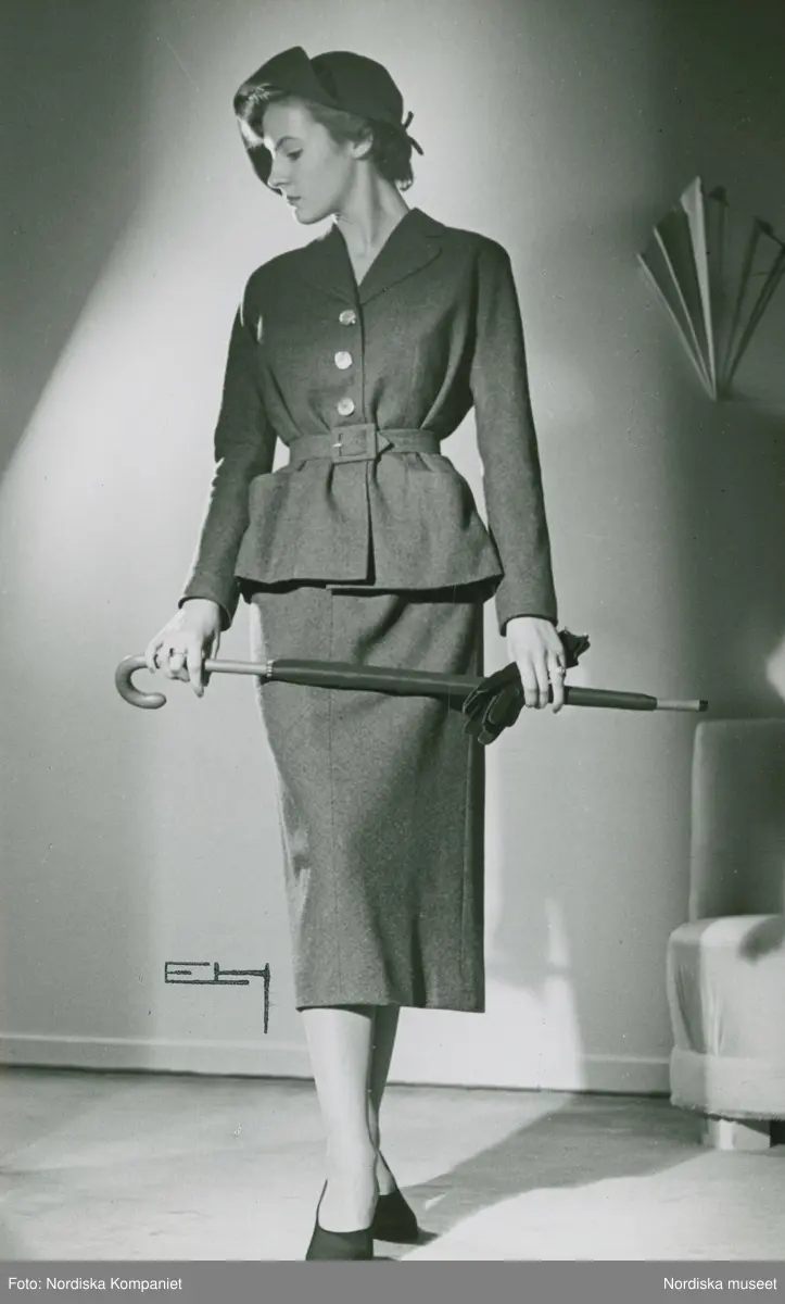 Modell i dräkt, hatt, pumps och paraply i handen.