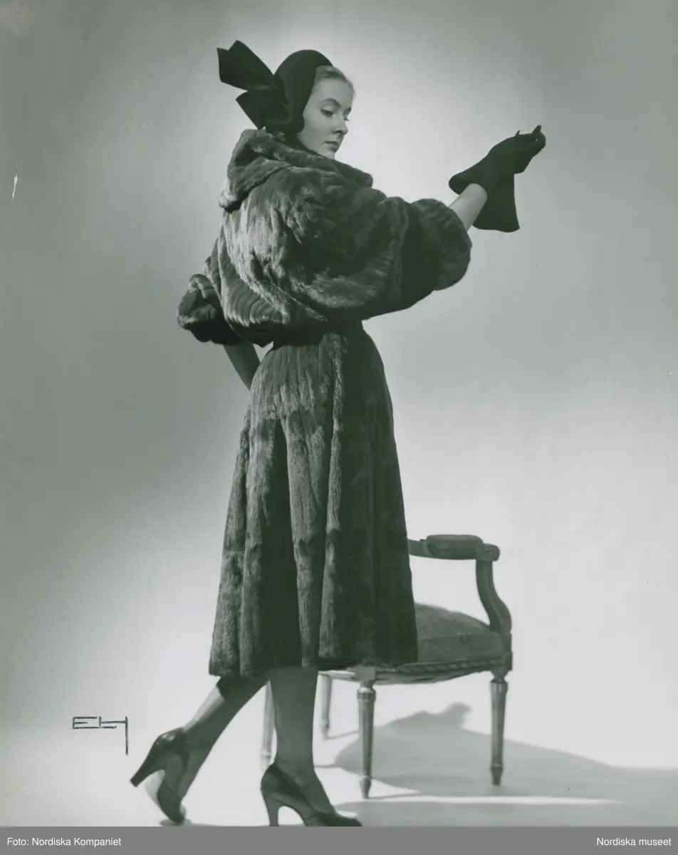 Modell i pälskappa, hatt med rosett, handskar och pumps.
