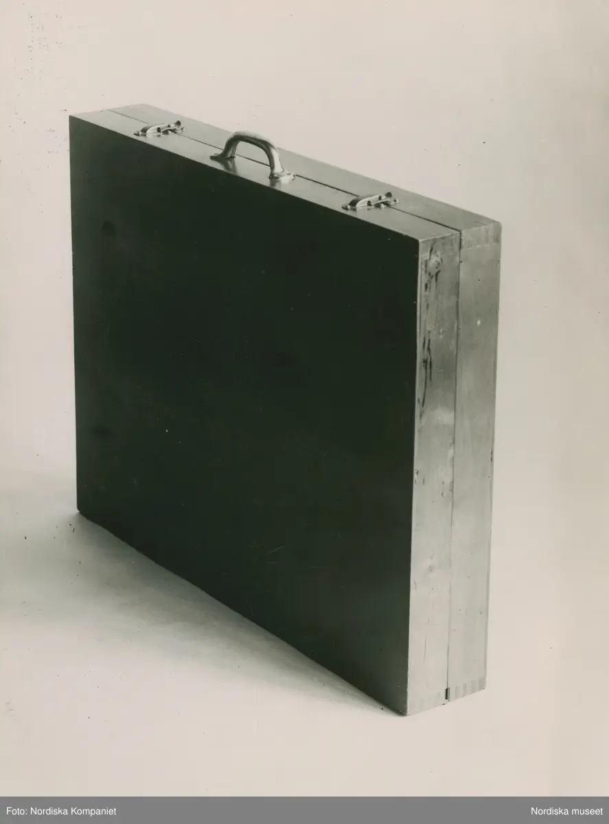 Väska/låda av trä med snäpplås och handtag av metall. Text med blyerts på baksidan: "D F Sport Bil"