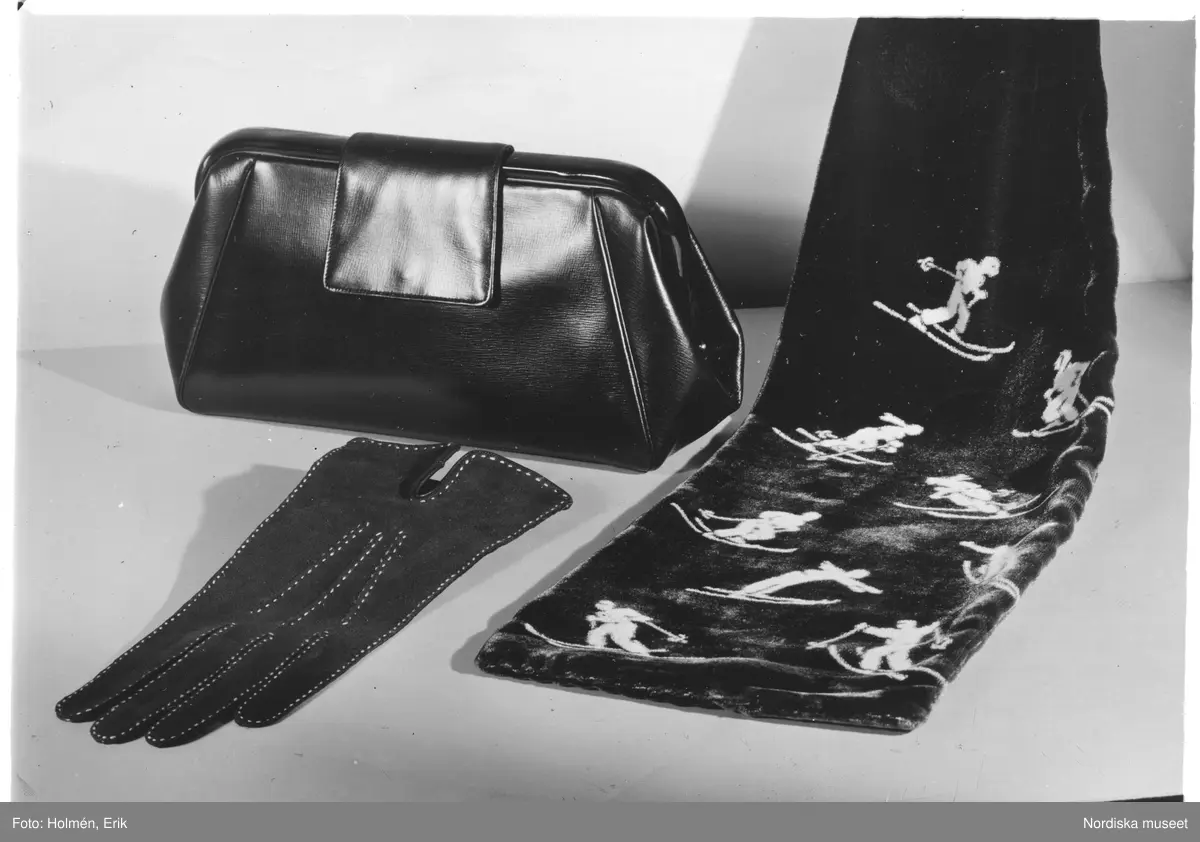 Väska i kalvskinn med galalitbåge, sammetsscarf med motiv av skidåkare, handskar av den korta handskmodellen med stickning.