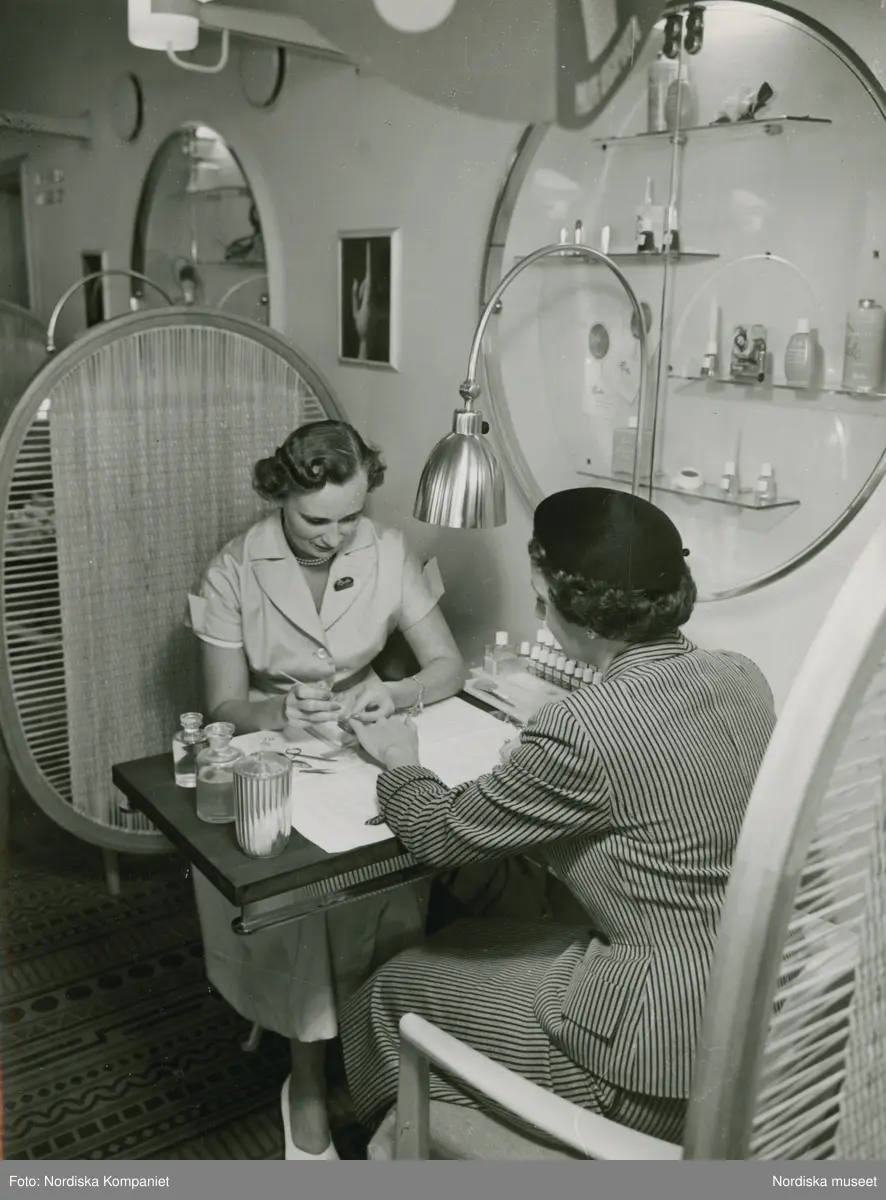 En kvinna i randig dräkt och svart hatt får manikyr. Nordiska Kompaniet.