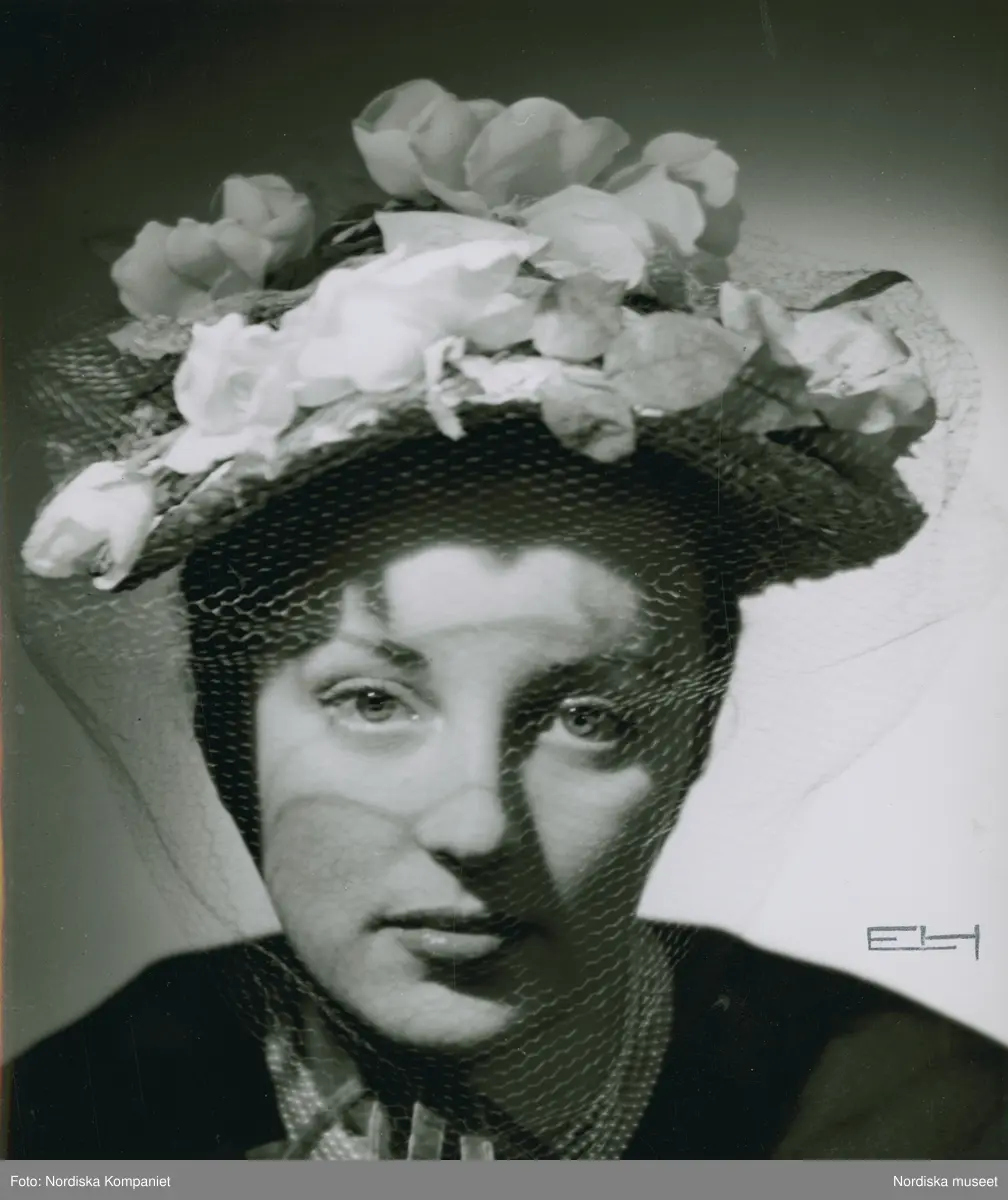 Porträtt av modell i halmgult strå med nyponblom och flor. Från Madame Paulette.