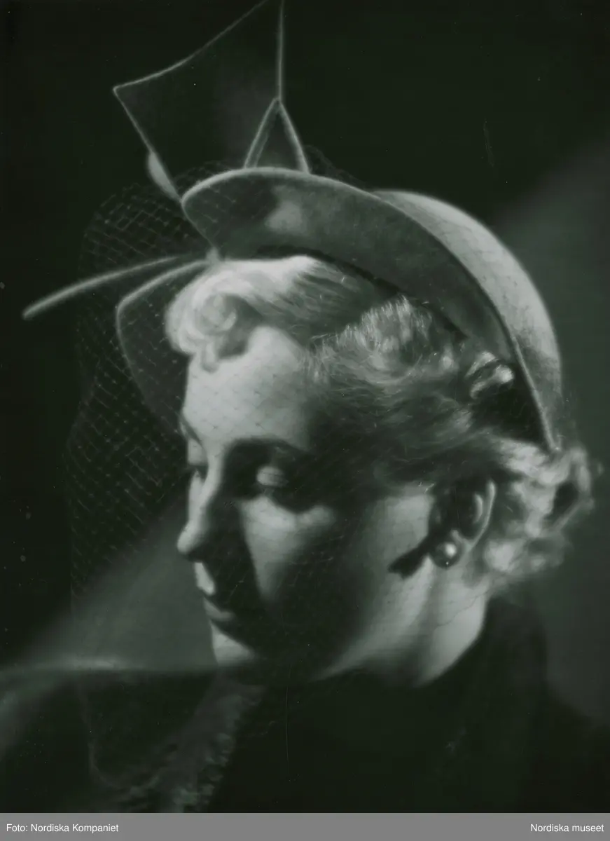 Porträtt av modell i beige filthatt med rosett av filt infodrat med brun jersey. Av Rose Descat.