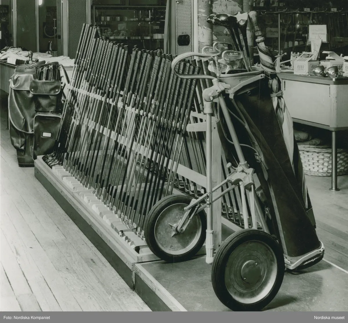 Butiksinteriör med golfväskor och golfklubbor. Nordiska Kompaniet.