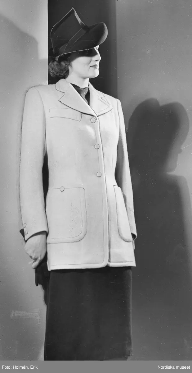 Modell i ljus kavaj och hatt. Från Madeleine de Rauch.