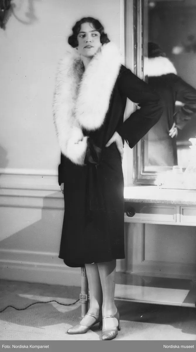 Modell i svart klänning med rävbesats, framför spegel.