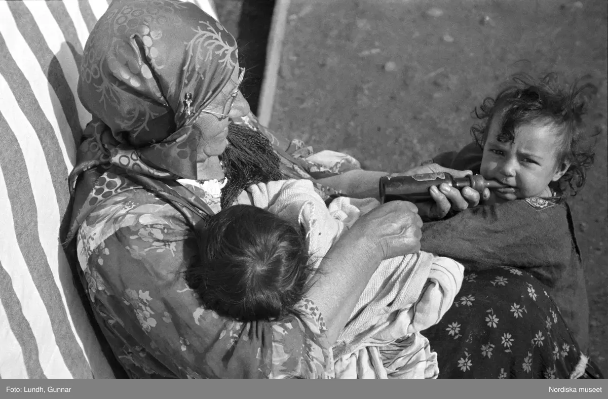 Leende kvinna sitter med ett barn i famnen samtidigt som hon leende matar en liten flicka med flaska. Familjen Taikons läger i Johanneshov, södra Stockholm.