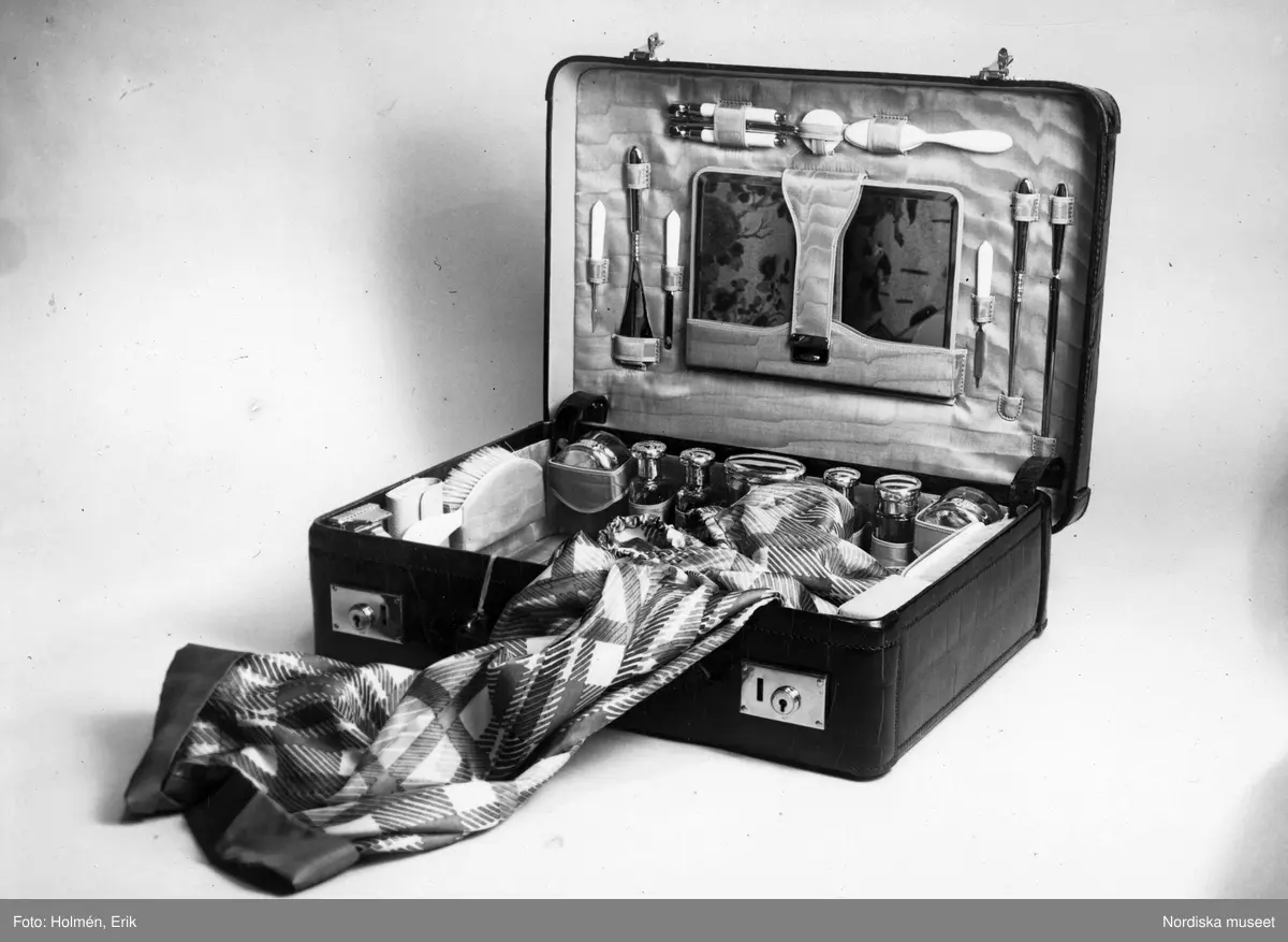 Reseffekter. Portfölj innehållande nagelvård, flaskor, borstar och en rutig textil.
