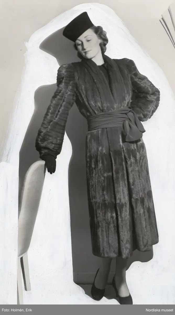 Nordiska Kompaniet. Kvinna i mörk päls med brett, draperat tygskärp. Mörk hatt.
