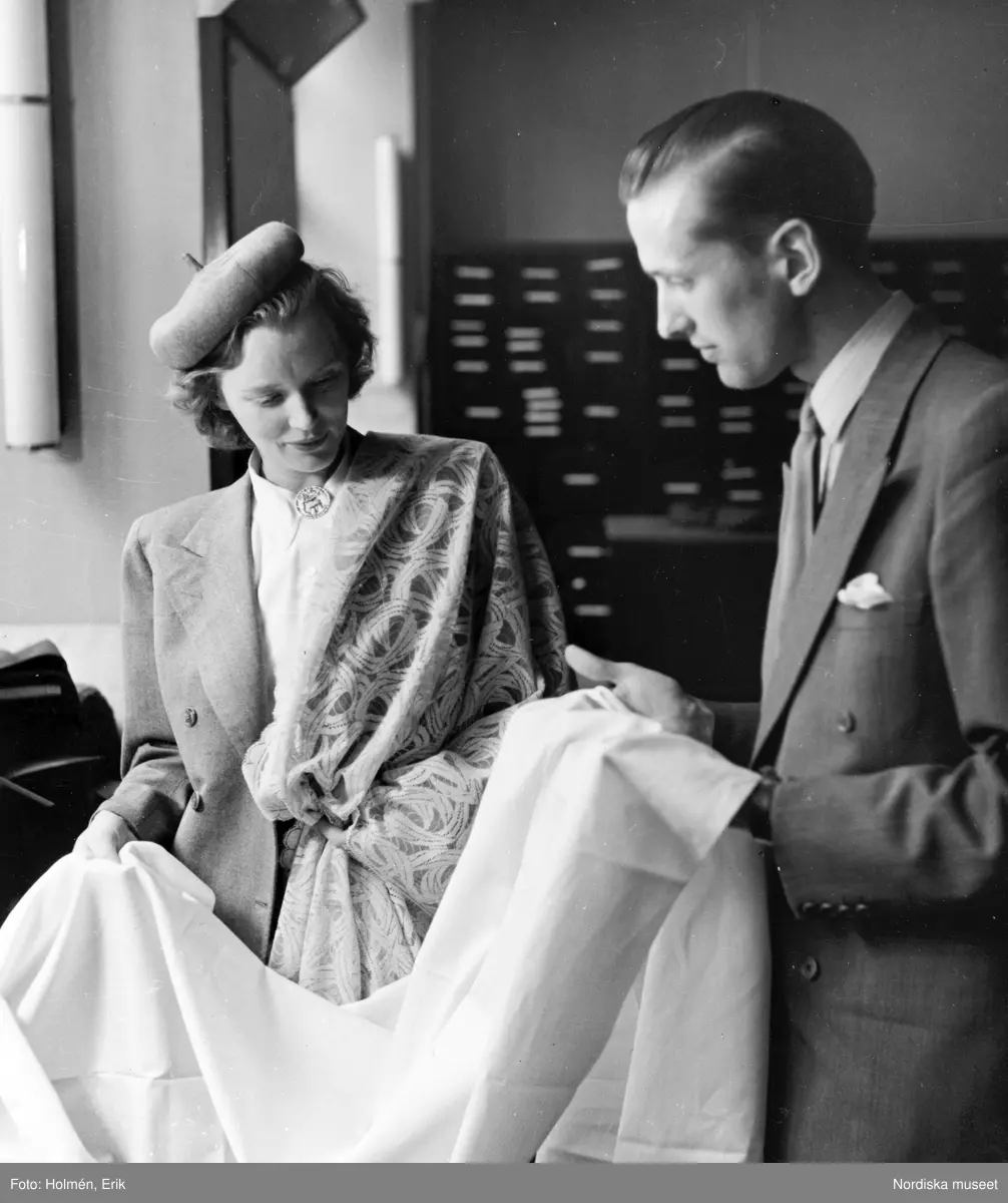 Kvinna klädd i kavaj och basker tittar på tyger på Nordiska Kompaniet.