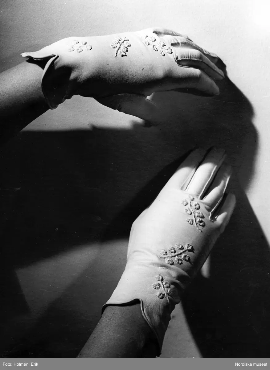 Vita handskar med blomstergarnering.
