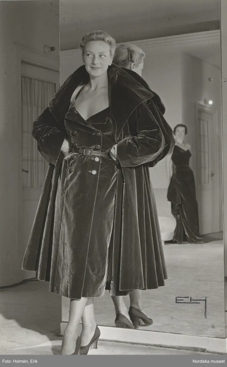 Nordiska Kompaniet. Kvinna i mörk, djupt ringad klänning med liten krage vid decolletaget och smala axelband. Snäv midja med skärp. Dubbla knapprader. Tillhörande mörk kappa av (sannolikt) sammet med bred krage. Text på baksidan: "Hösten -49 Molyneux bläckblå"