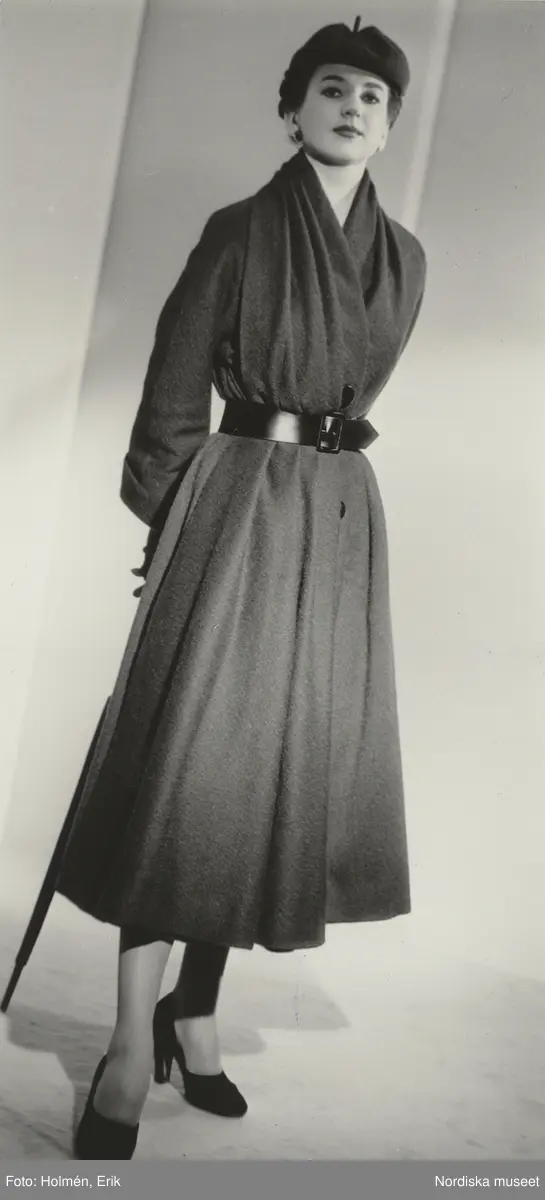Modell i kappa med skärp, basker och paraply i handen. Från Clarence.