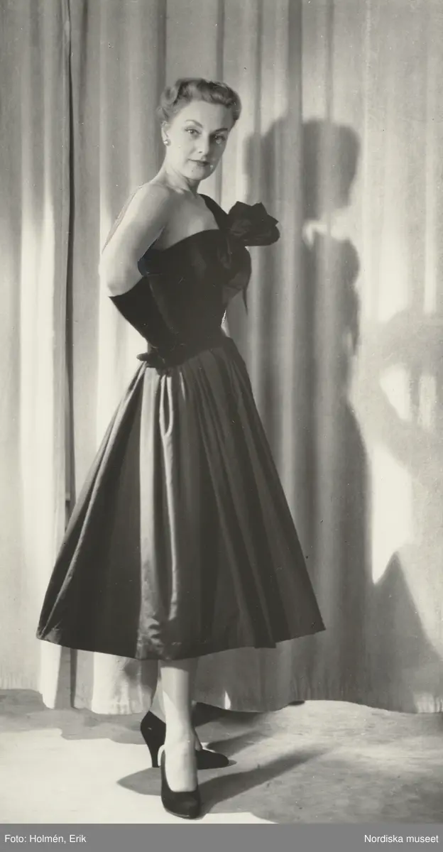 Modell i aftonklänning med rosett, handskar och pumps, framför draperi. Från Christian Dior.