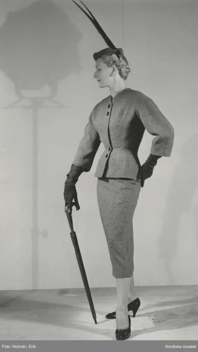 Modell i dräkt i brun melerad tweed, hatt med hög fjäderpenna, handskar och paraply. Från Jacques Fath.