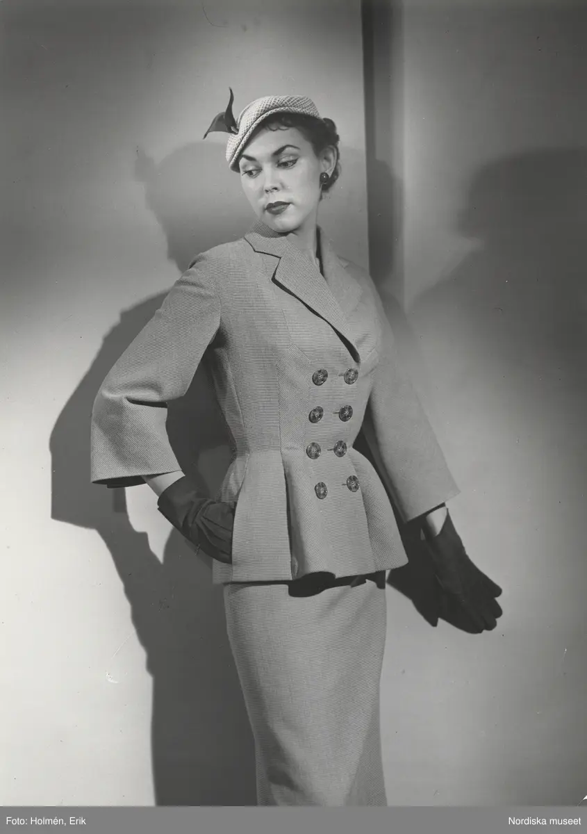 Modell i dräkt, skärmhatt med garnering och handskar. Från Jacques Fath.