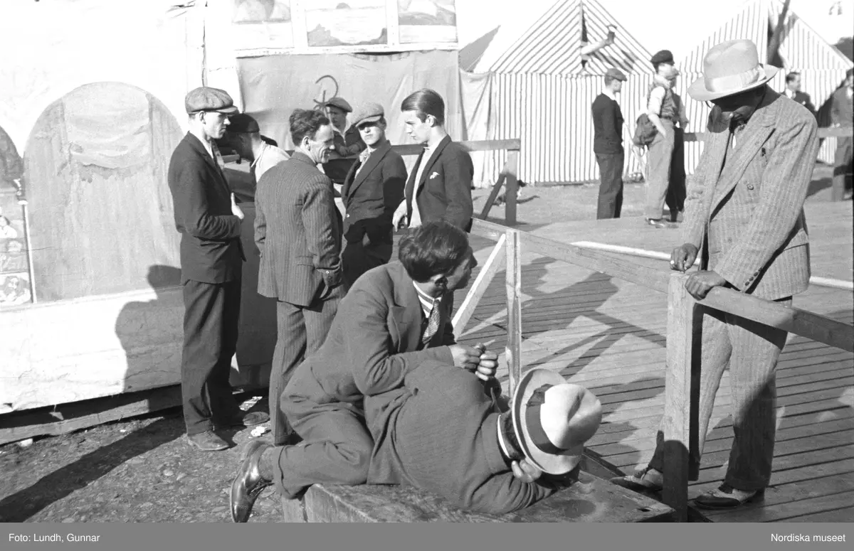 En grupp män, några samtalar, några vilar. Familjen Taikons läger i Johanneshov, södra Stockholm.