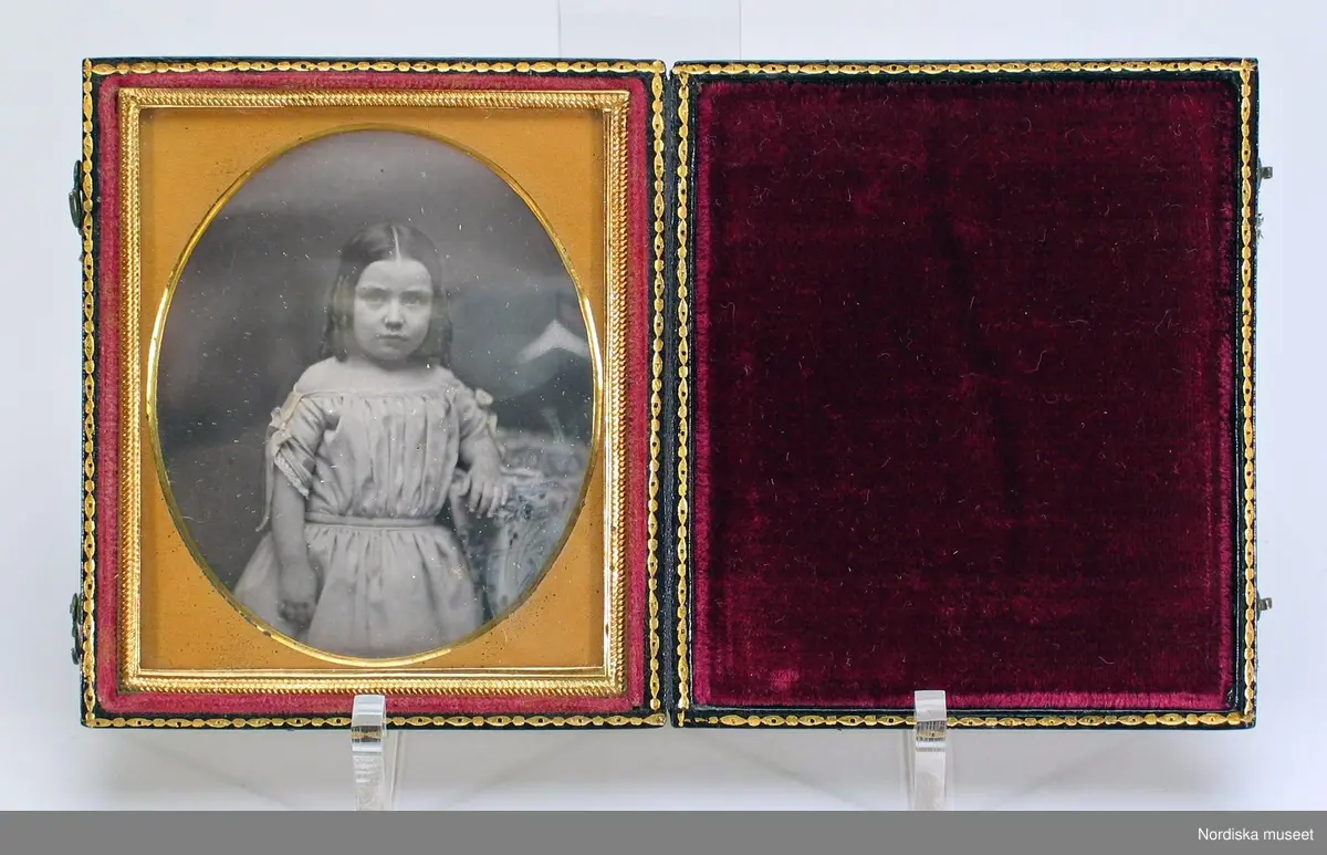 Porträtt av okänd flicka i sammetsfodrat etui av amerikansk typ. Dagerrotyp / daguerreotyp. Nordiska museet inv.nr 113501.