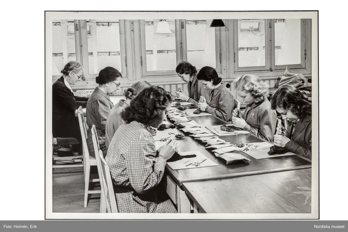Brodöser på NK:s Franska damskrädderis sömnadsateljé. Kvinnor sitter vid ett arbetsbord och broderar.