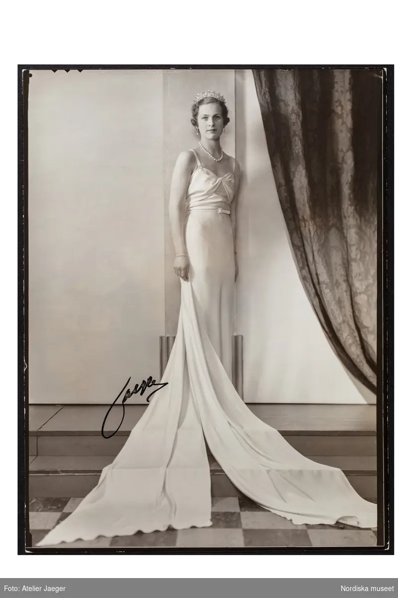 Porträtt i helfigur. Ceremonimästarinna vid Amaranterbalen friherrinnan Ingeborg af Ugglas (född Lewenhaupt) bär hellång klänning av vit crêpe peau d'ange, släp i två delar. Diadem, örhängen, armband och brosch med infattade pärlor, runt halsen pärlcollier. NK:s Franska damskrädderi.