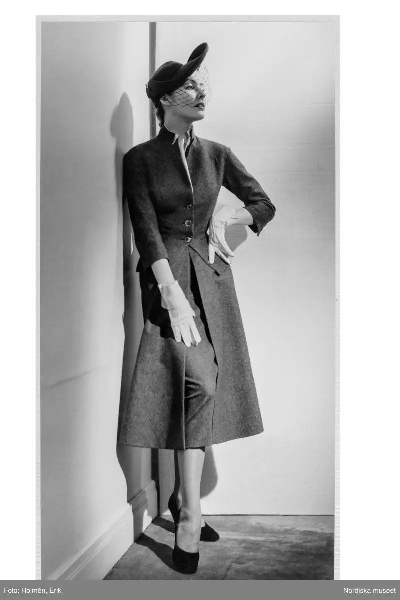 Mannekäng poserar iklädd dräkt i provrummet på NK:s Franska damskrädderi. Figursydd dräktjacka, stusslång med liten krage, tre knappar fram och trekvartslång ärm. Vadlång kjol med stort gångveck framtill. Hatt med glest flor, handskar och pumps.