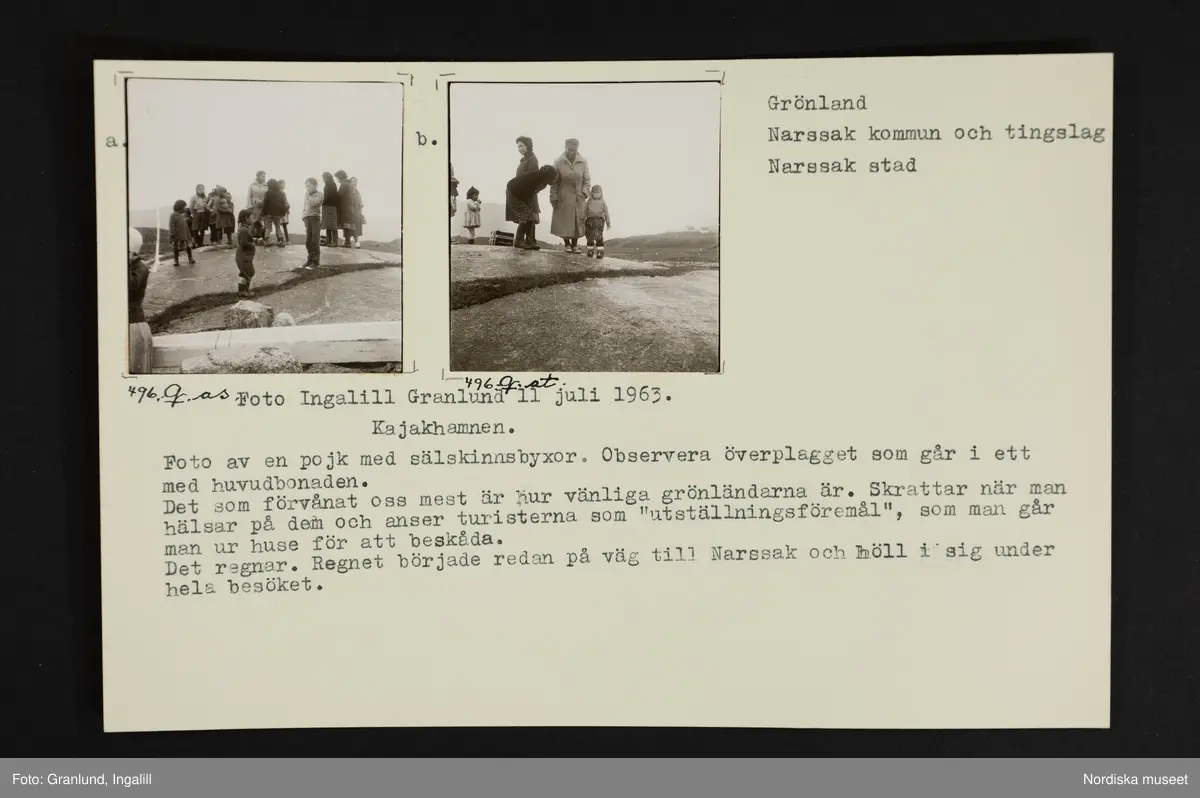 Ark med två monterade foton och text: "Kajakhamnen. Foto av en pojk med sälskinnsbyxor. Observera överplagget som går i ett med huvudbonaden. Det som förvånat oss mest är hur vänliga grönländarna är. Skrattar när man hälsar på dem och anser turisterna som "utställningsföremål", som man går man ur huse för att beskåda.
