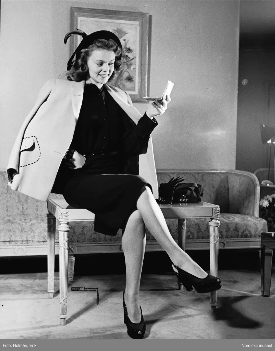 Nordiska Kompaniet visar dammode. Kvinna iklädd klänning, jacka, slingbacks och hatt med fjäderpenna sitter på bordskant och speglar sig.