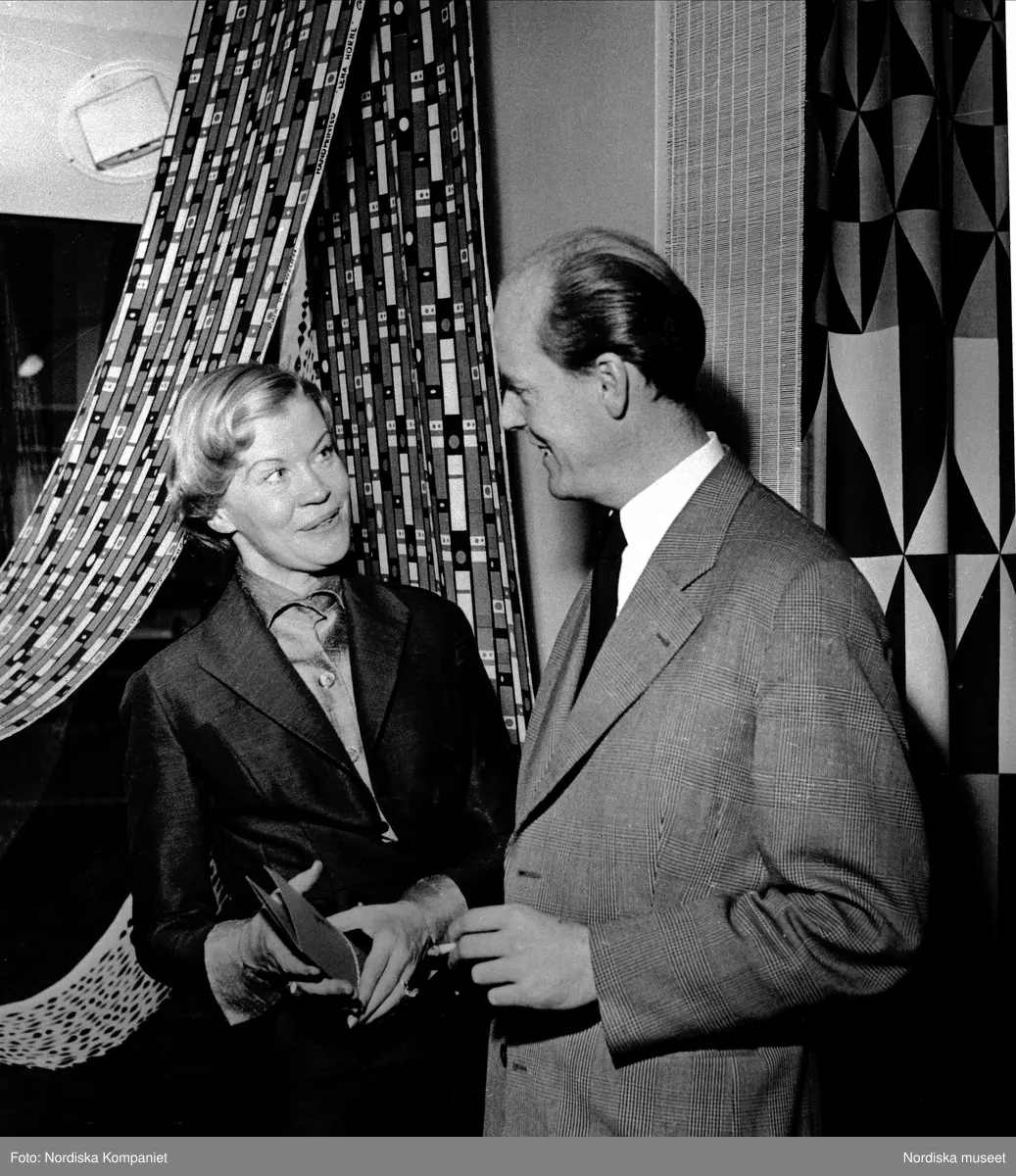 Astrid Sampe, chef för Nordiska Kompaniets textilkammare, på vernissage för utställningen "Signerad textil".