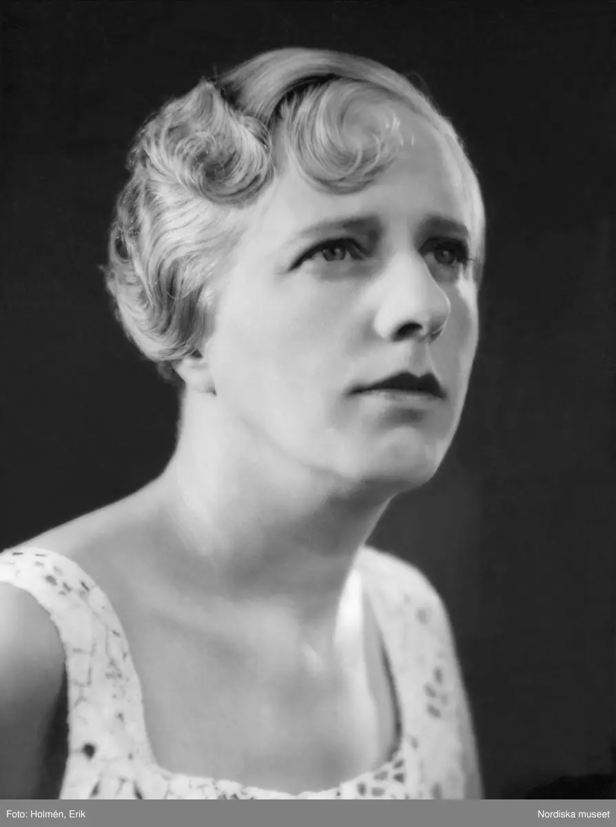 Kvinnlig modell i klänning med genombruten spets. Nordiska Kompaniet.