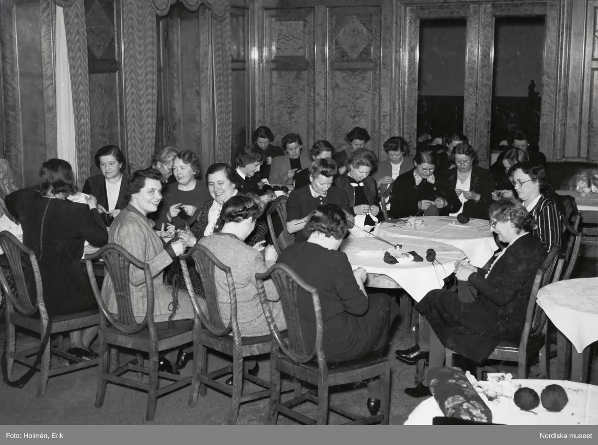 Beredskapsstickning på Nordiska kompaniet. En grupp kvinnor sitter runt bord och stickar.
