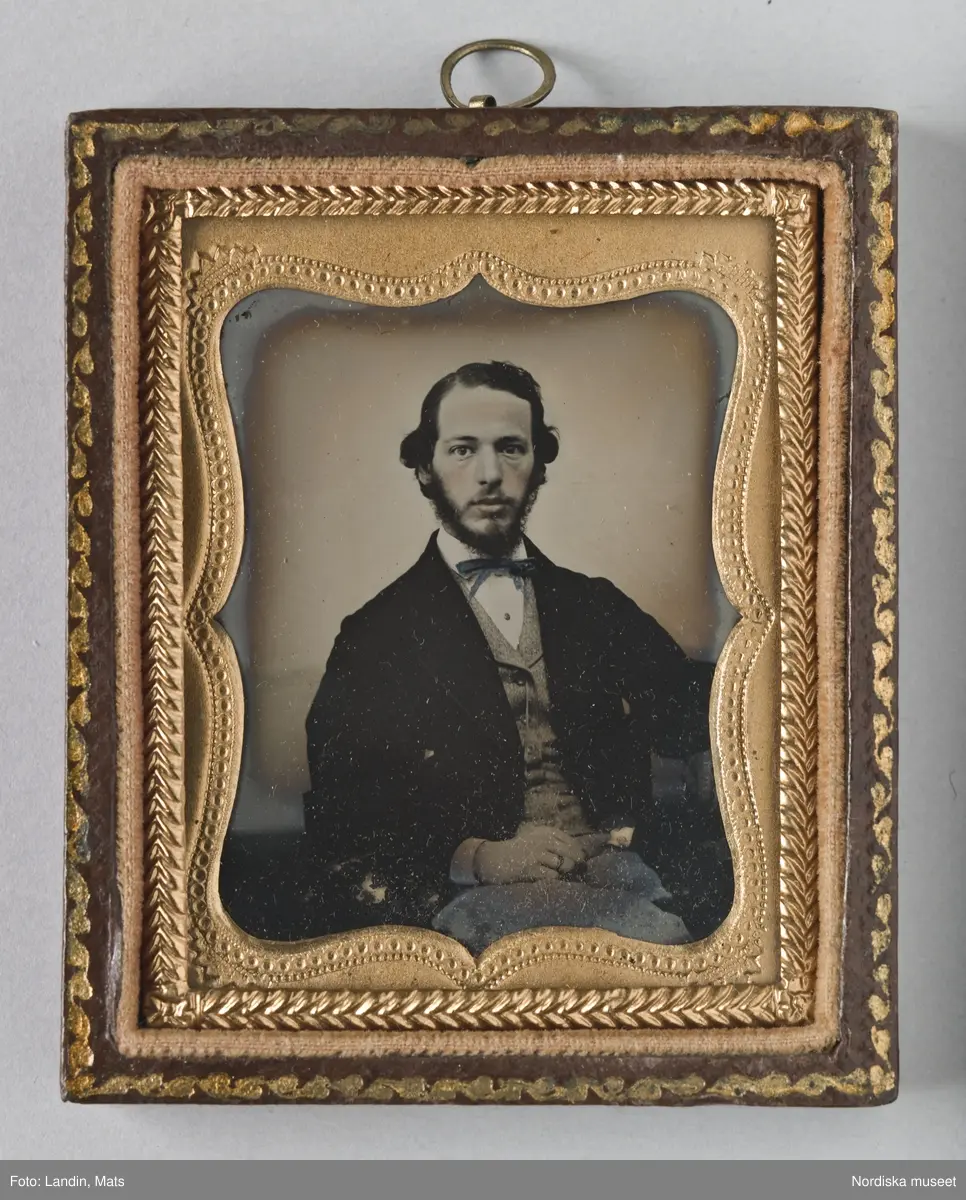 Porträtt, till dockskåp, av ung sittande man med skepparkrans, iklädd rock och väst. Handkolorerad ambrotypi, kollodiumemulsion på glasplåt med svartlackerad baksida.. Nordiska museet inv.nr 189503