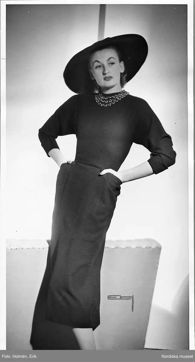 Christian Diors vårmode visas i Stockholm 1947. Kvinnlig modell i ledig pose, iklädd jumper, kjol och vidbrättad hatt. Runt halsen bär hon ett treradigt halssmycke
