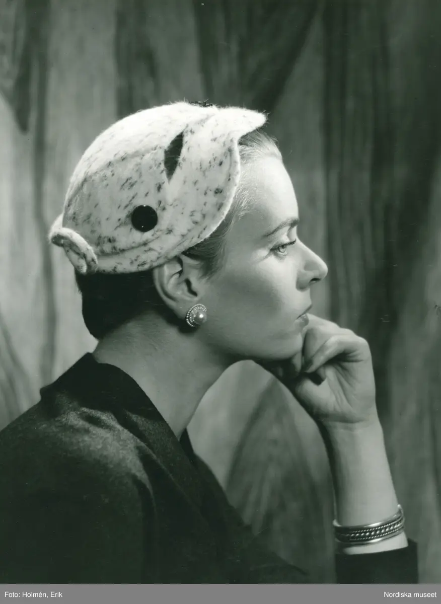 FA, Porträtt av kvinna i hatt med knapp, samt örhängen och armband.