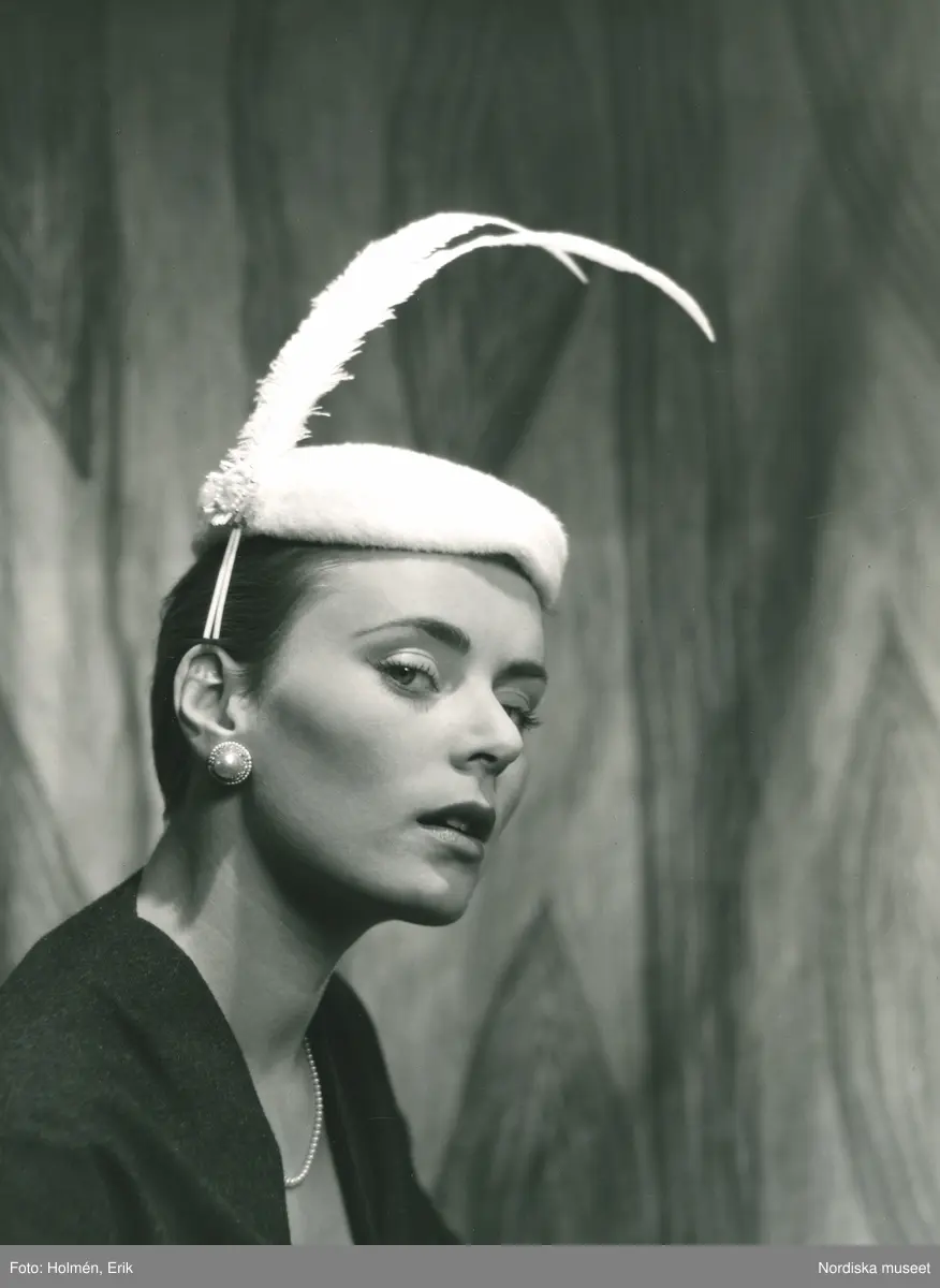 FA, Porträtt av kvinna i hatt med penna, samt örhängen och pärlhalsband.