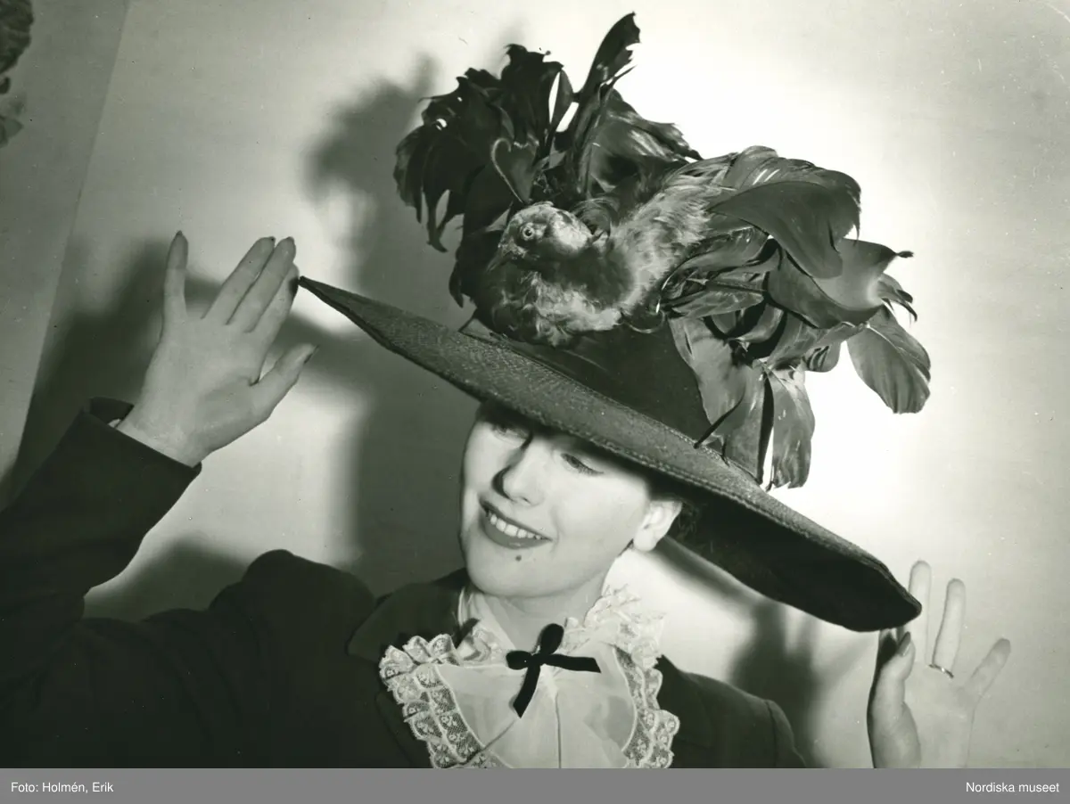 Porträtt av kvinna i bredbrättad hatt med fjädrar och fågeldekoration, av Suzanne Talbot.