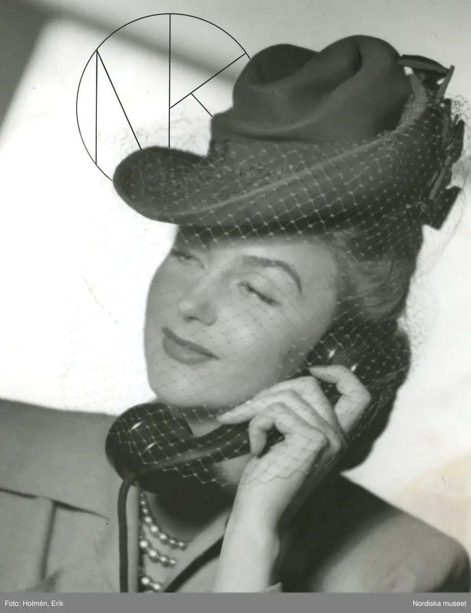 Porträtt av kvinna klädd i hatt med dekorband och flor, kavaj och treradigt pärlhalsband, håller i en telefonlur.