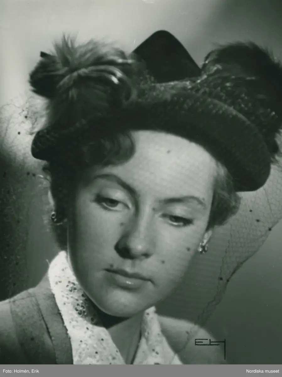 Porträtt av kvinna i svart sammetshatt med pompons( en svart och en rosa). Modell från Maud et Nano.